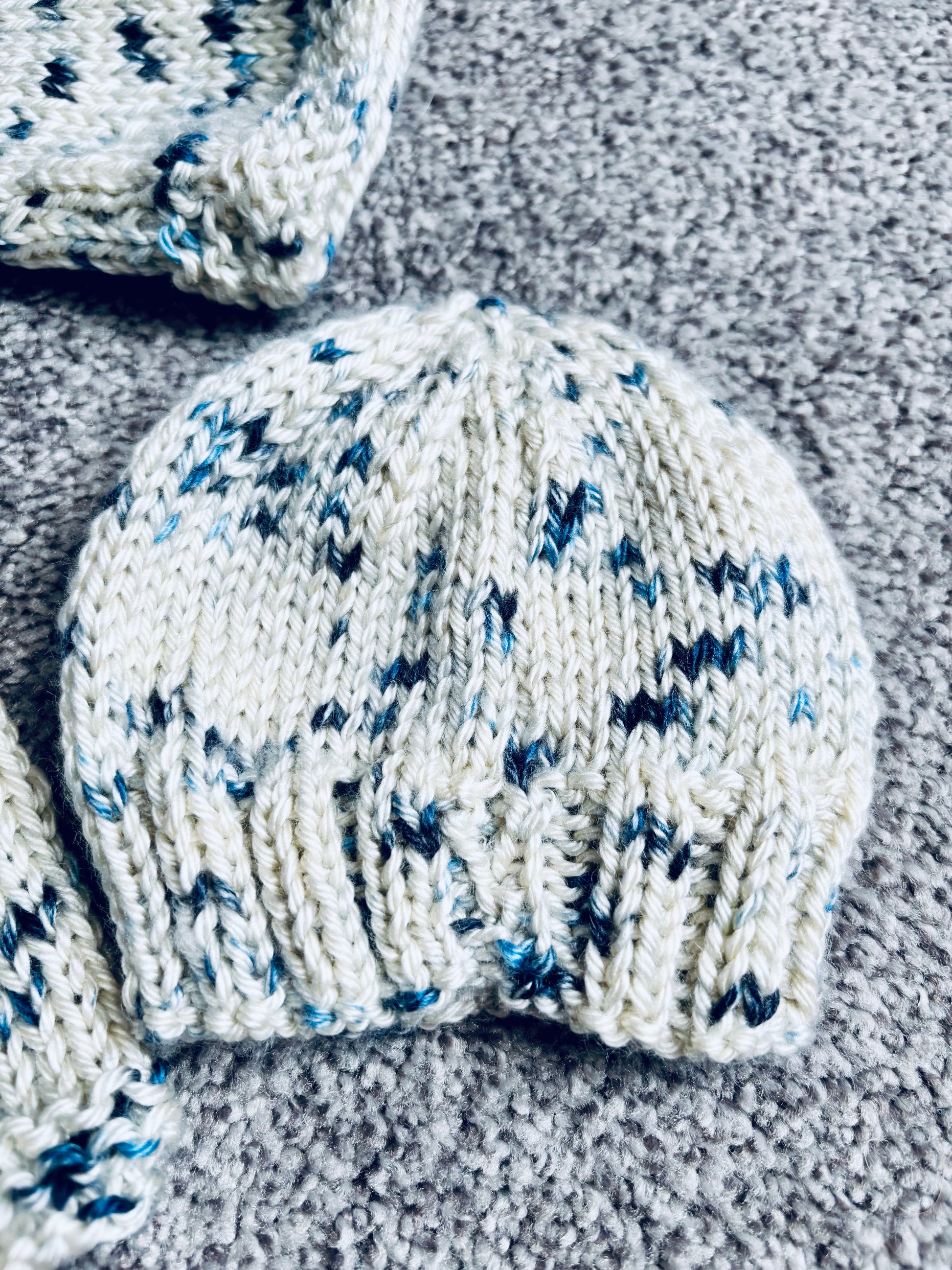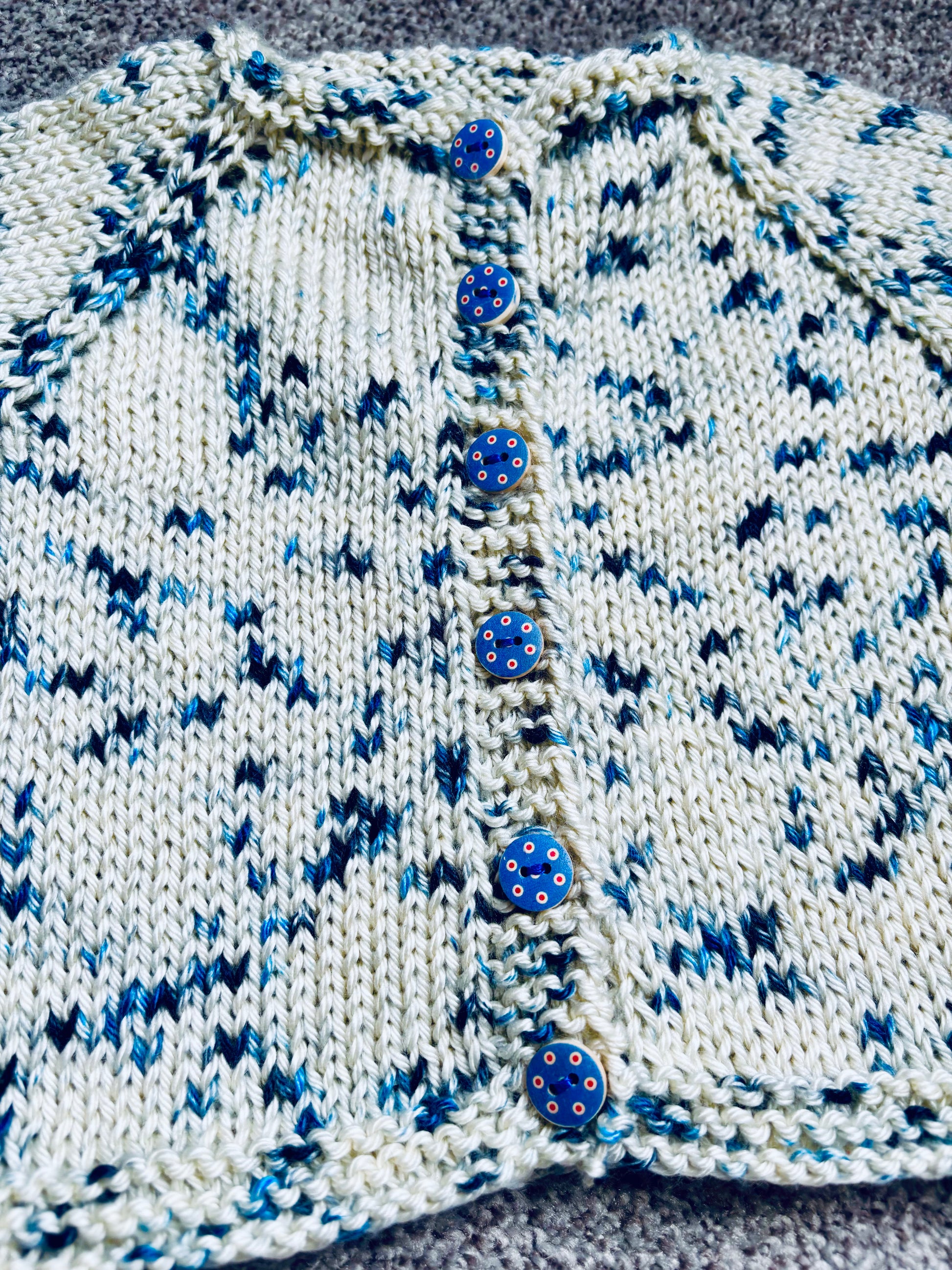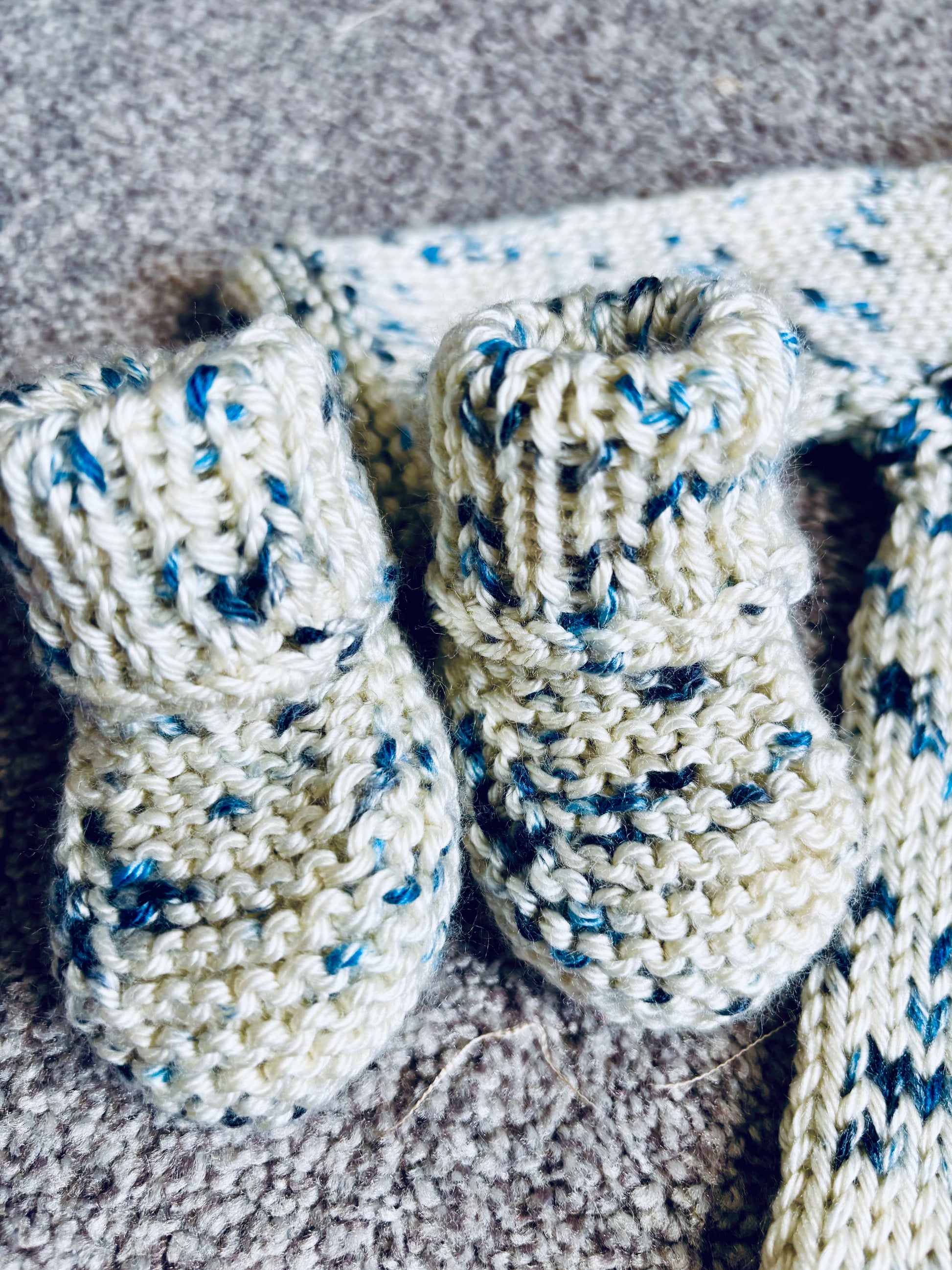 This set is perfect for a new little one as it’s meant to grow as they do. The hat is meant for a newborn and the booties are 0-3 months. The little cardigan is 3-6 months. The whole set is knit of an ultra soft acrylic yarn and is washable.
