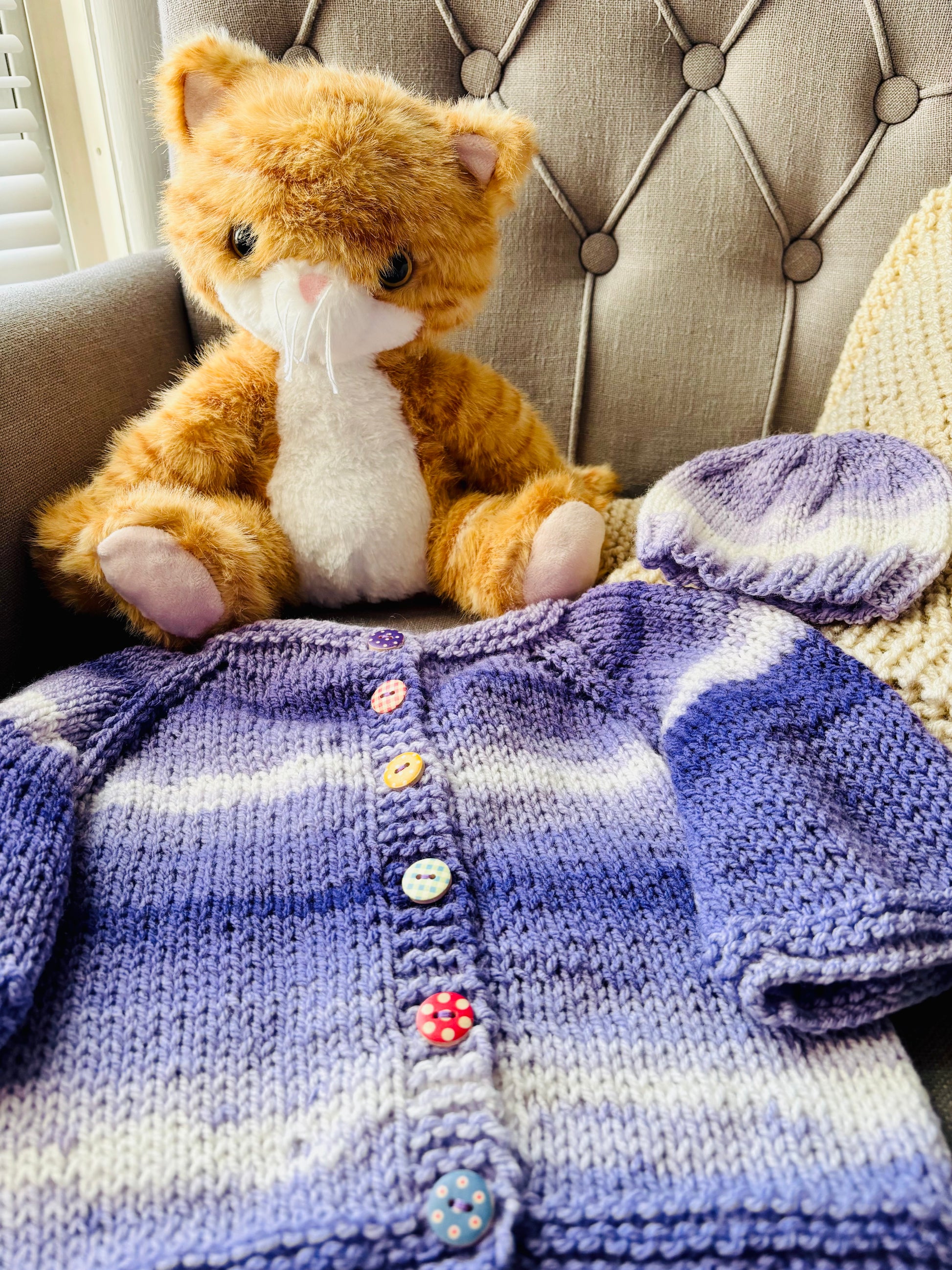 This colorful and whimsical set will keep your little one warm and cheerful as they grow! Includes a newborn sized hat, a pair of booties sized 0-3 months, and a cardigan sized 3-6 months. Made of a soft acrylic blend, all pieces are machine washable and should be air dried. Made to order, so please allow 7-10 days for shipping once I receive your order. Color and shade pattern may vary based on yarn dye and availability.