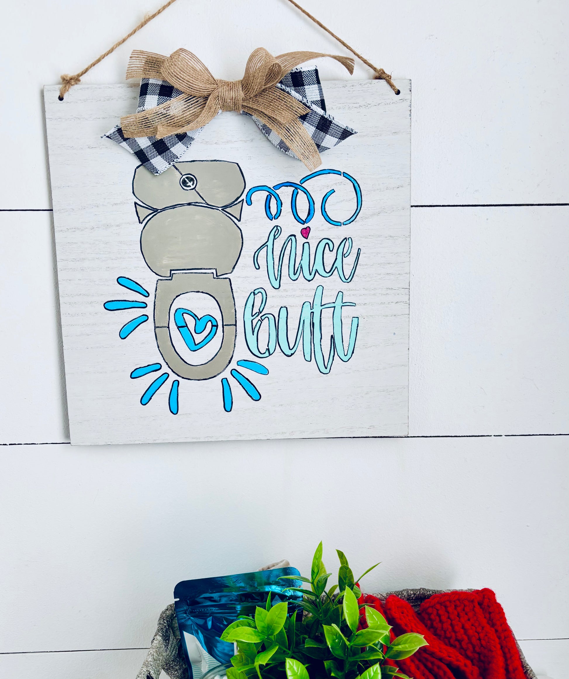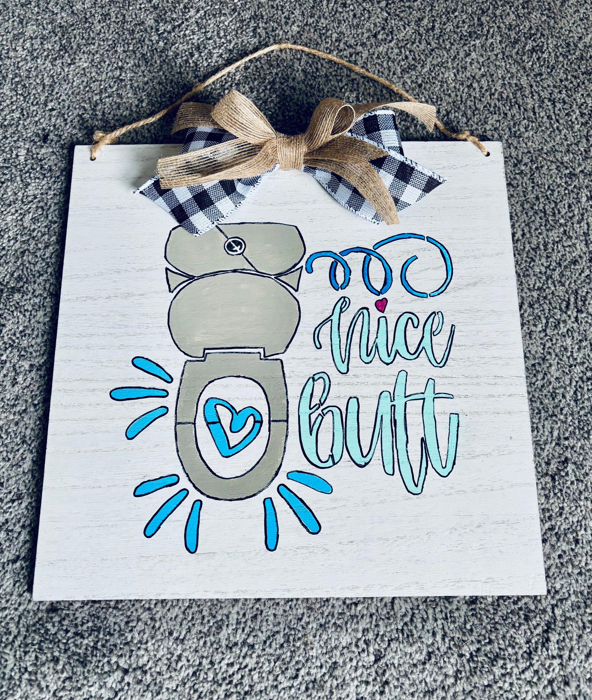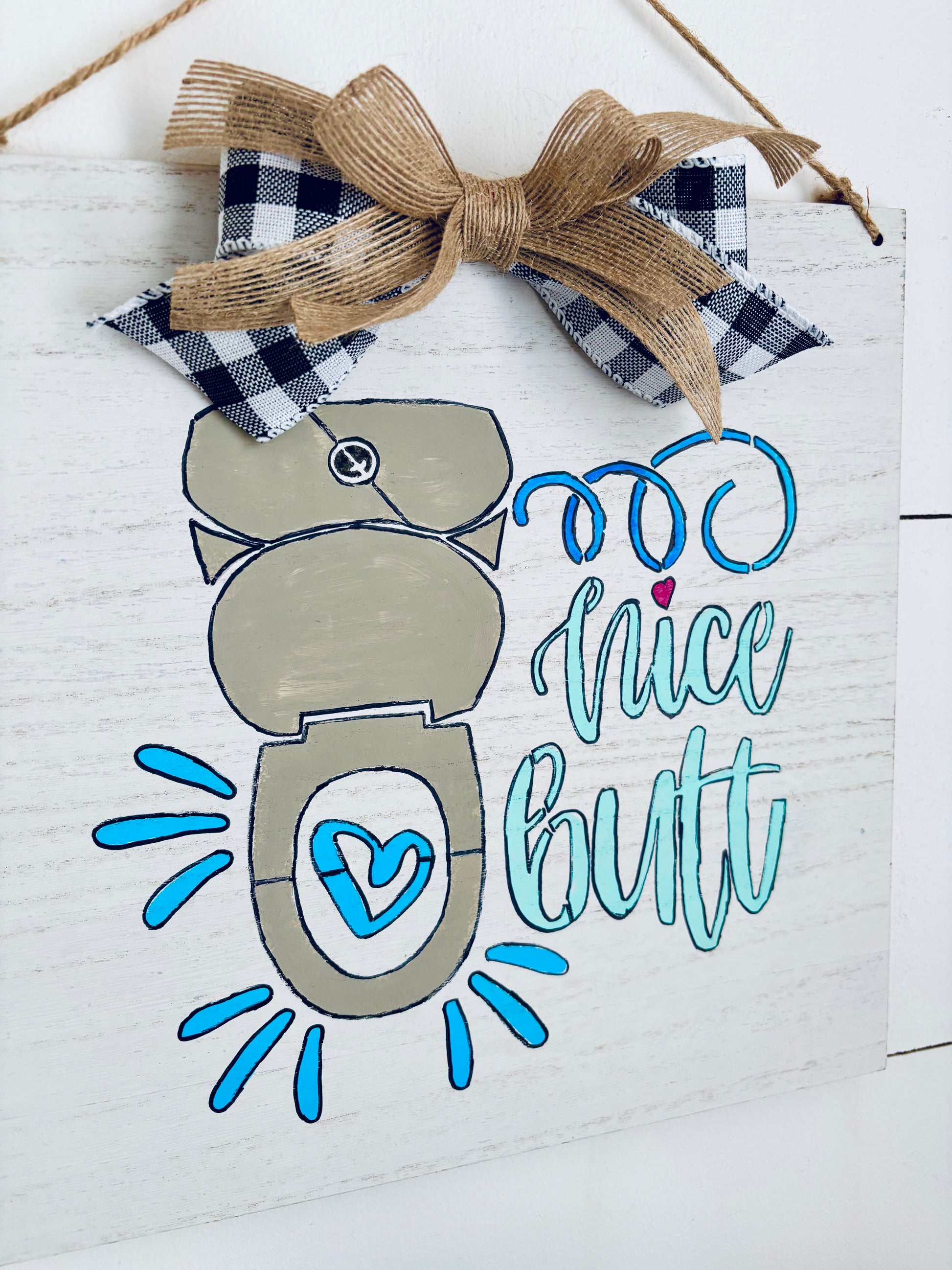 A cute and cheeky sign for your bathroom or washroom. Hand painted and outlined by hand, this piece measures 12” square and also features a handmade bow. The sign is also 1/2” thick. Each piece is unique due to its hand painted design. Please allow 1-2 days for shipping once I receive your order.